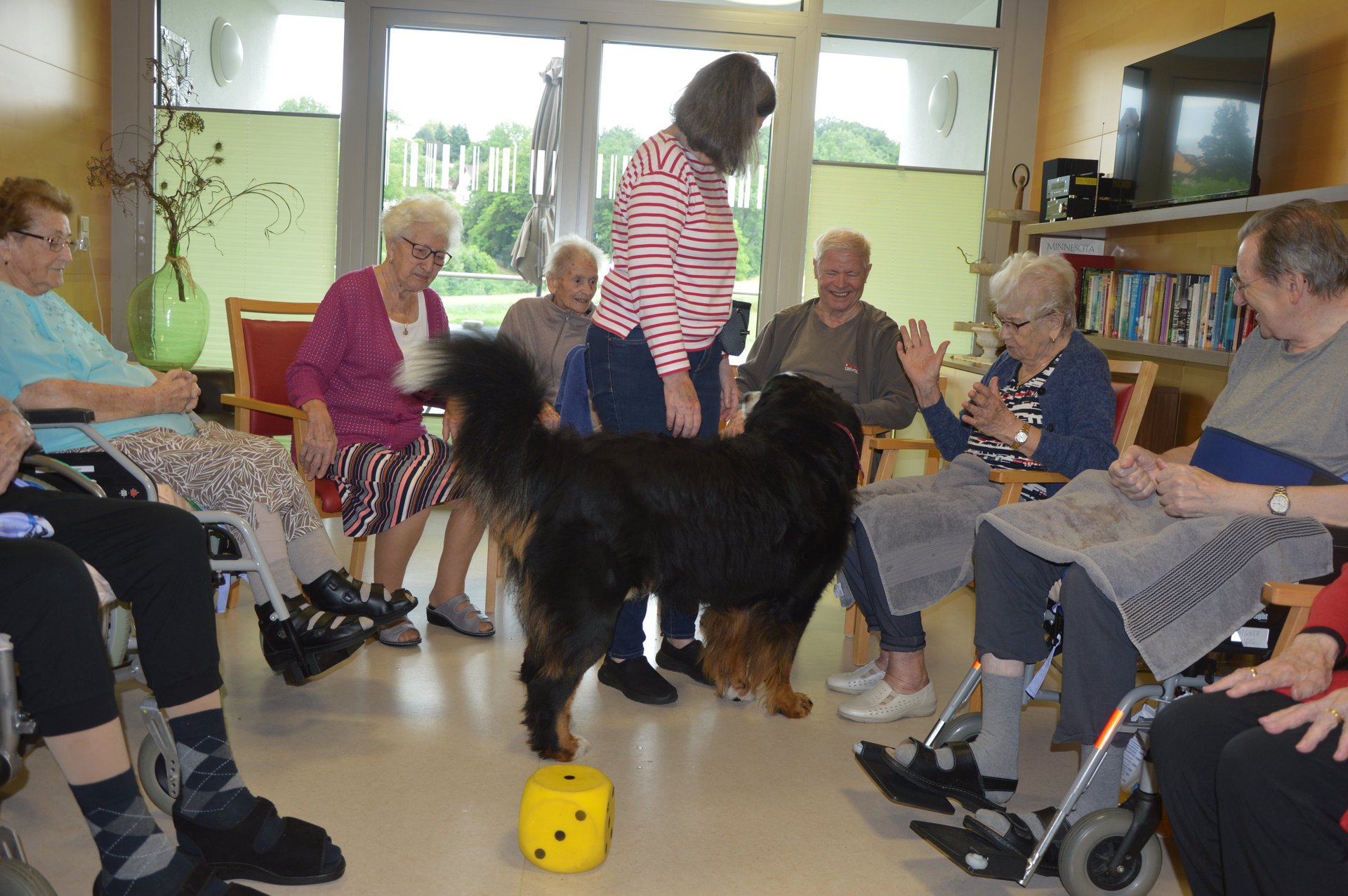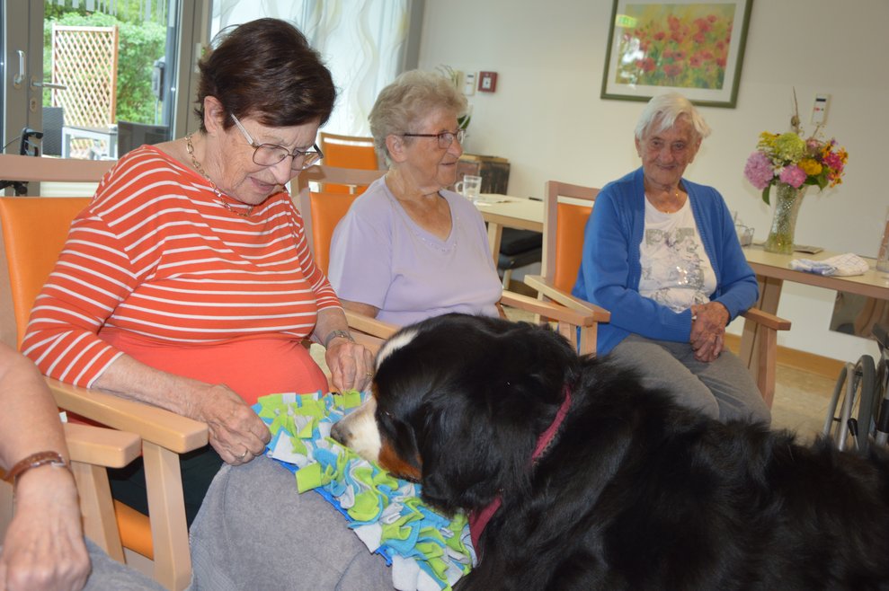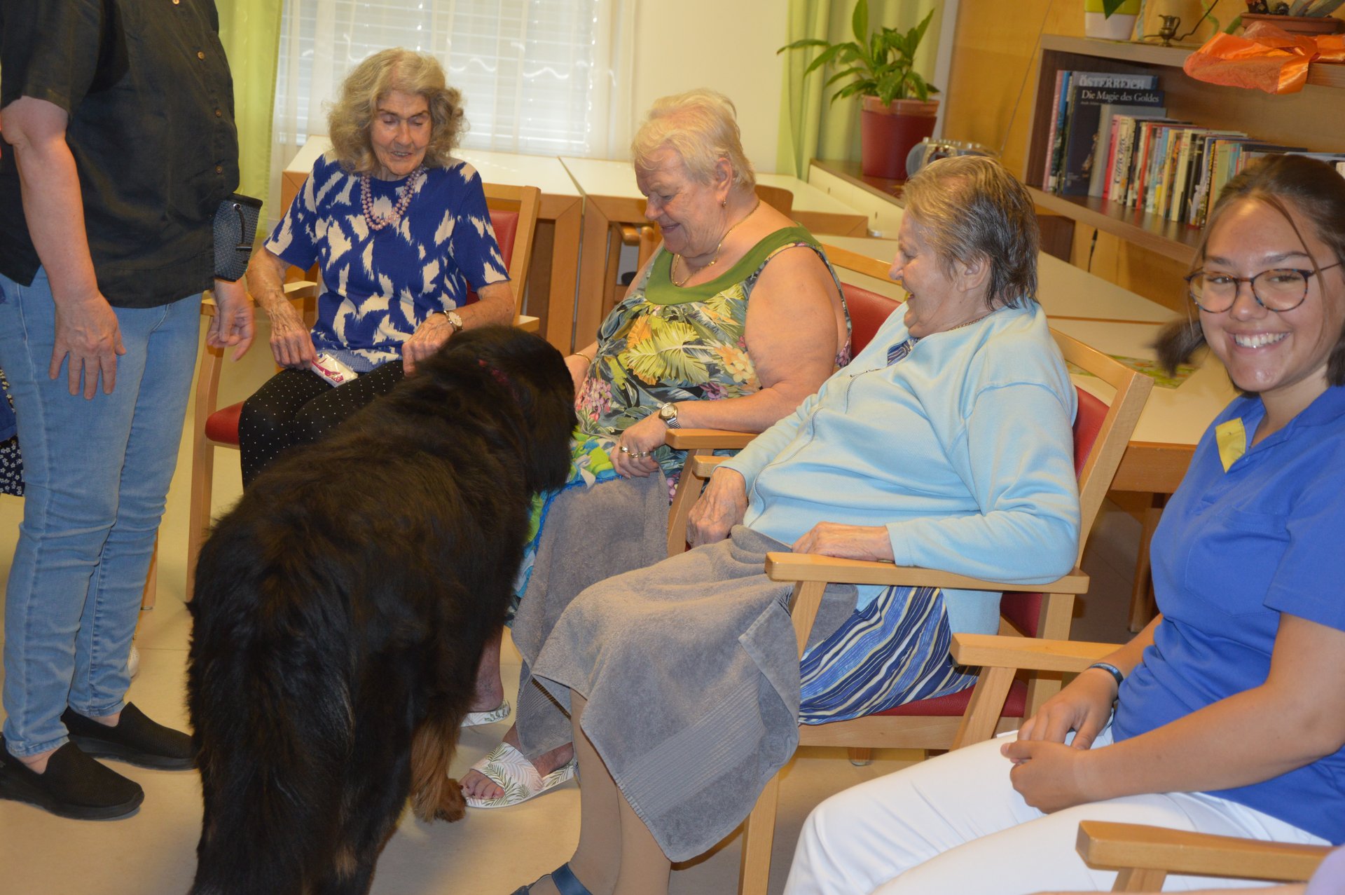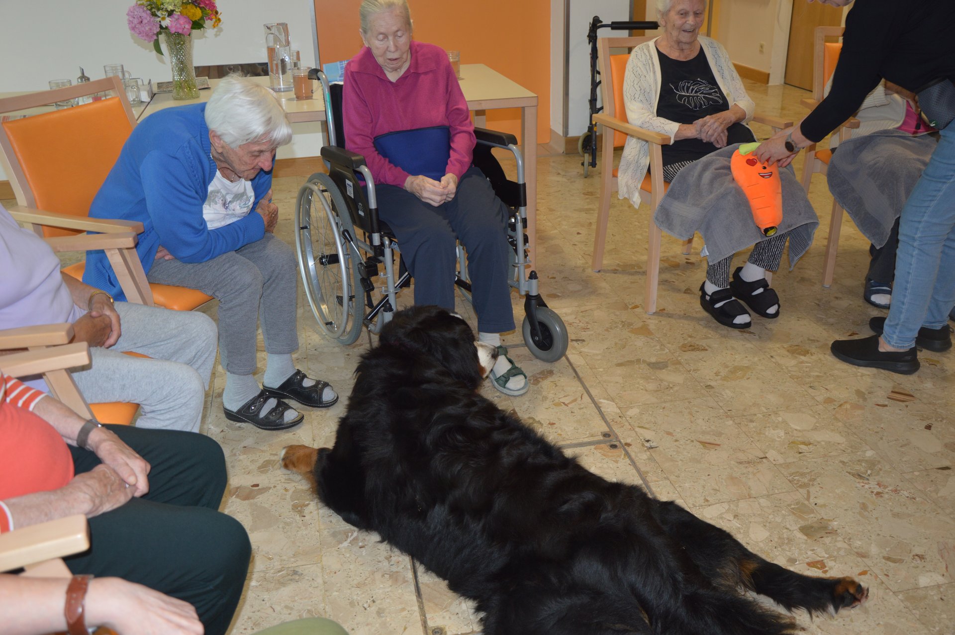 Seit Anfang Juni gibt es ein neues Highlight für unsere Bewohnerinnen und Bewohner – sie bekommen alle zwei Wochen Besuch vom Therapiehund Lenny und seiner Besitzerin Elisabeth.