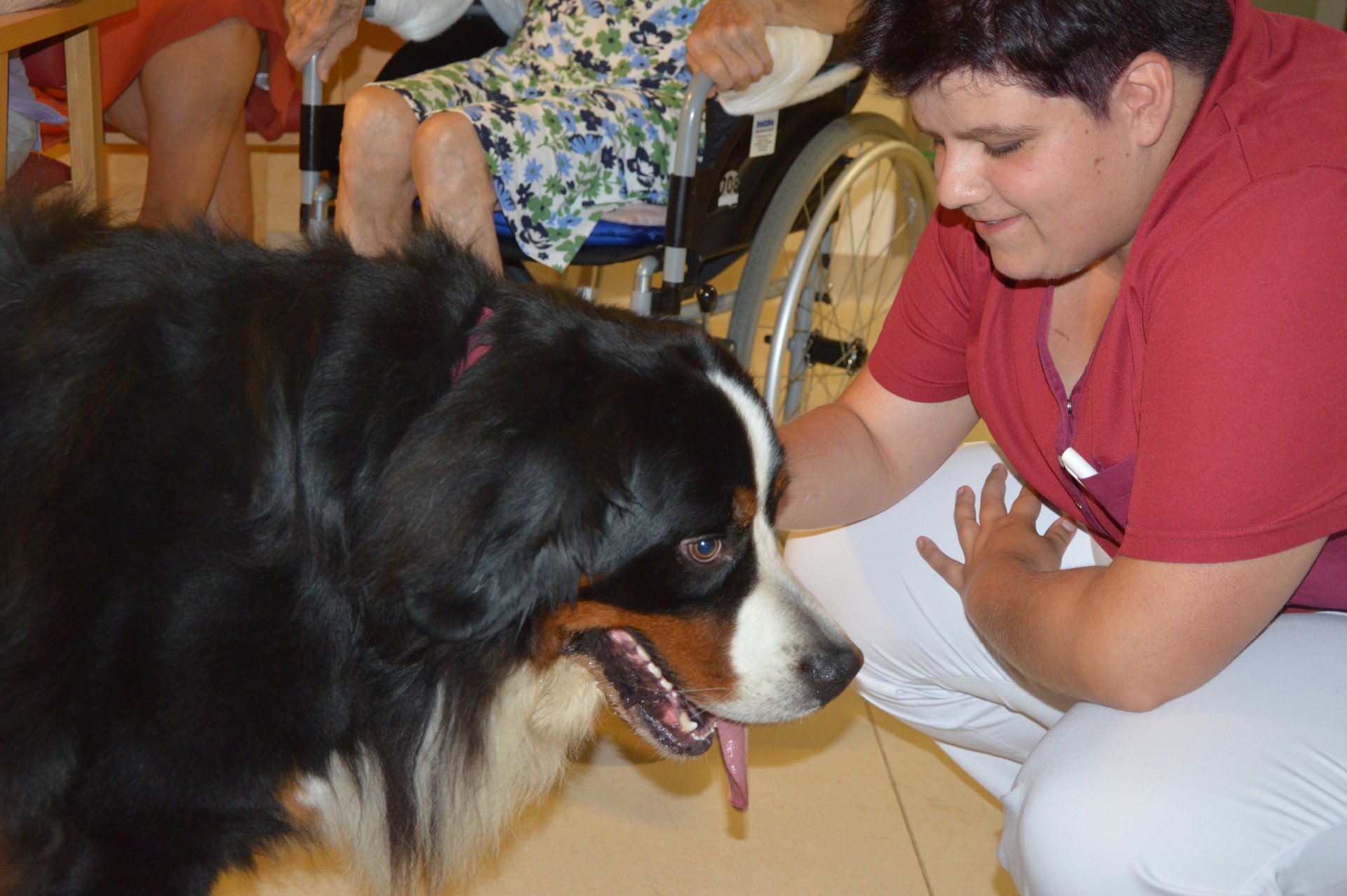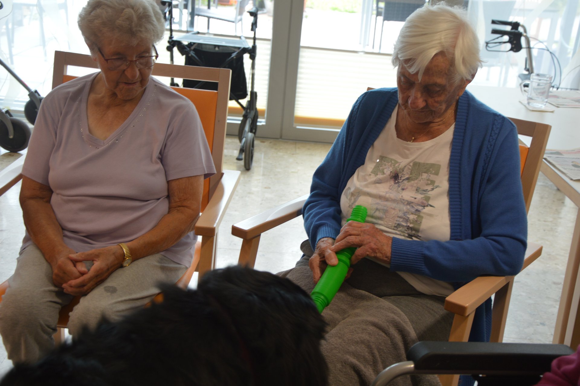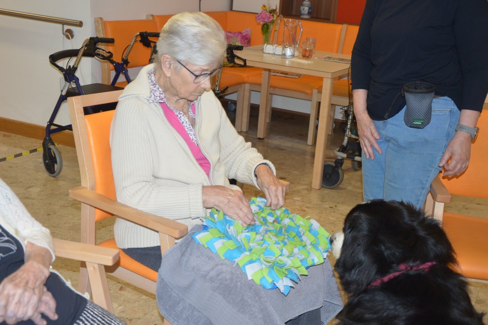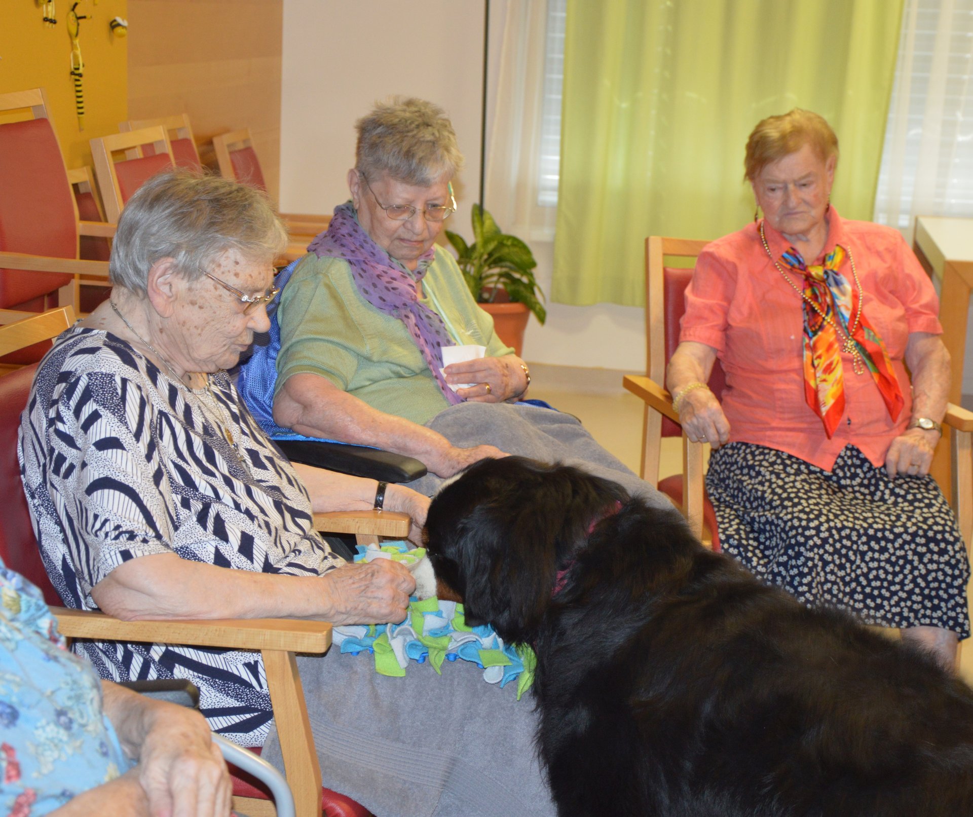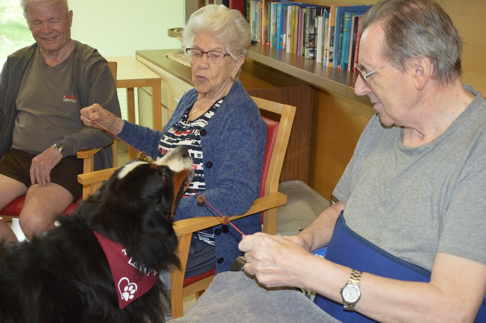 Seit Anfang Juni gibt es ein neues Highlight für unsere Bewohnerinnen und Bewohner – sie bekommen alle zwei Wochen Besuch vom Therapiehund Lenny und seiner Besitzerin Elisabeth.