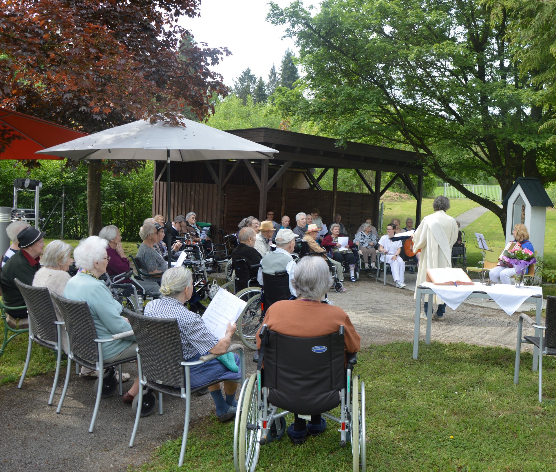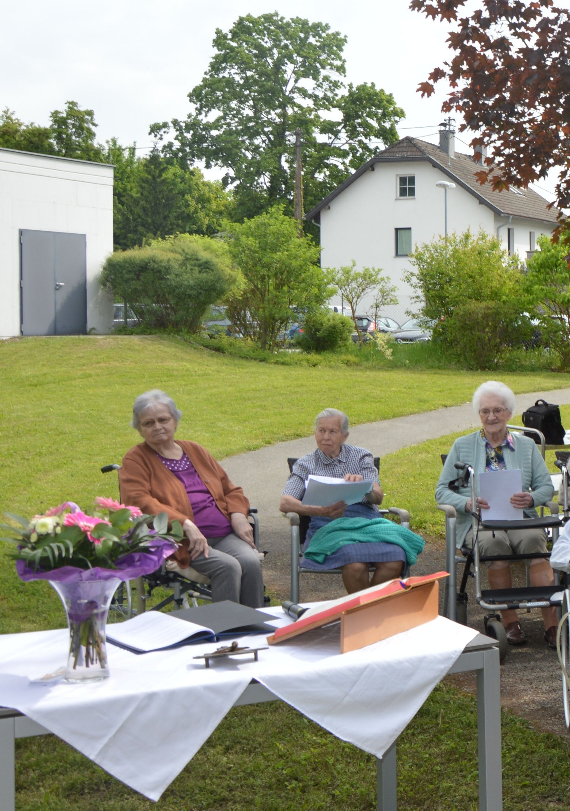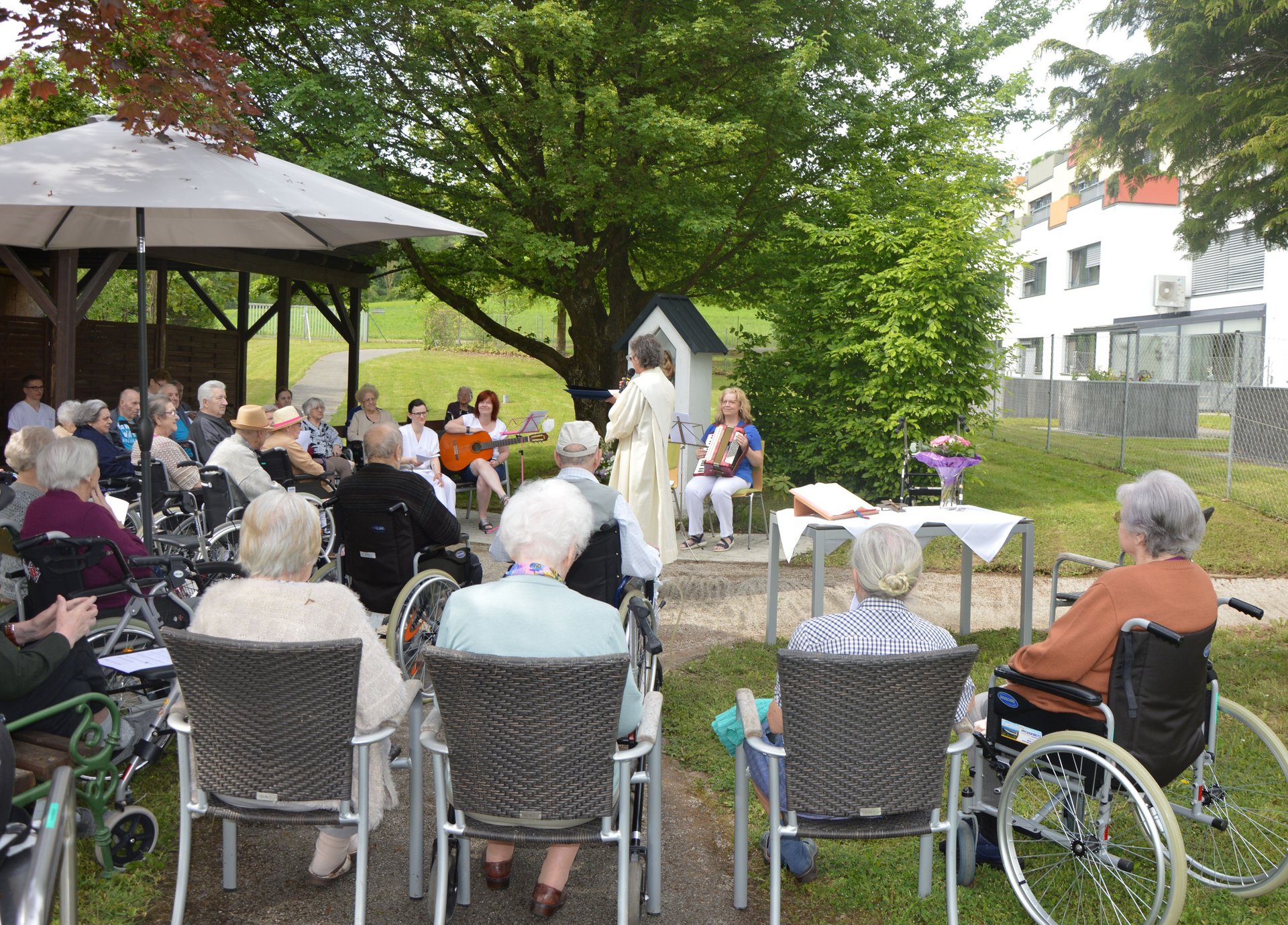 Im Garten beim Marterl fand eine Maiandacht mit Diakon Josef Poschenreithner statt. Musikalisch umrahmten Sie Mitarbeiterinnen mit Ihren Instrumenten der Gitarre und der Ziehharmonika.