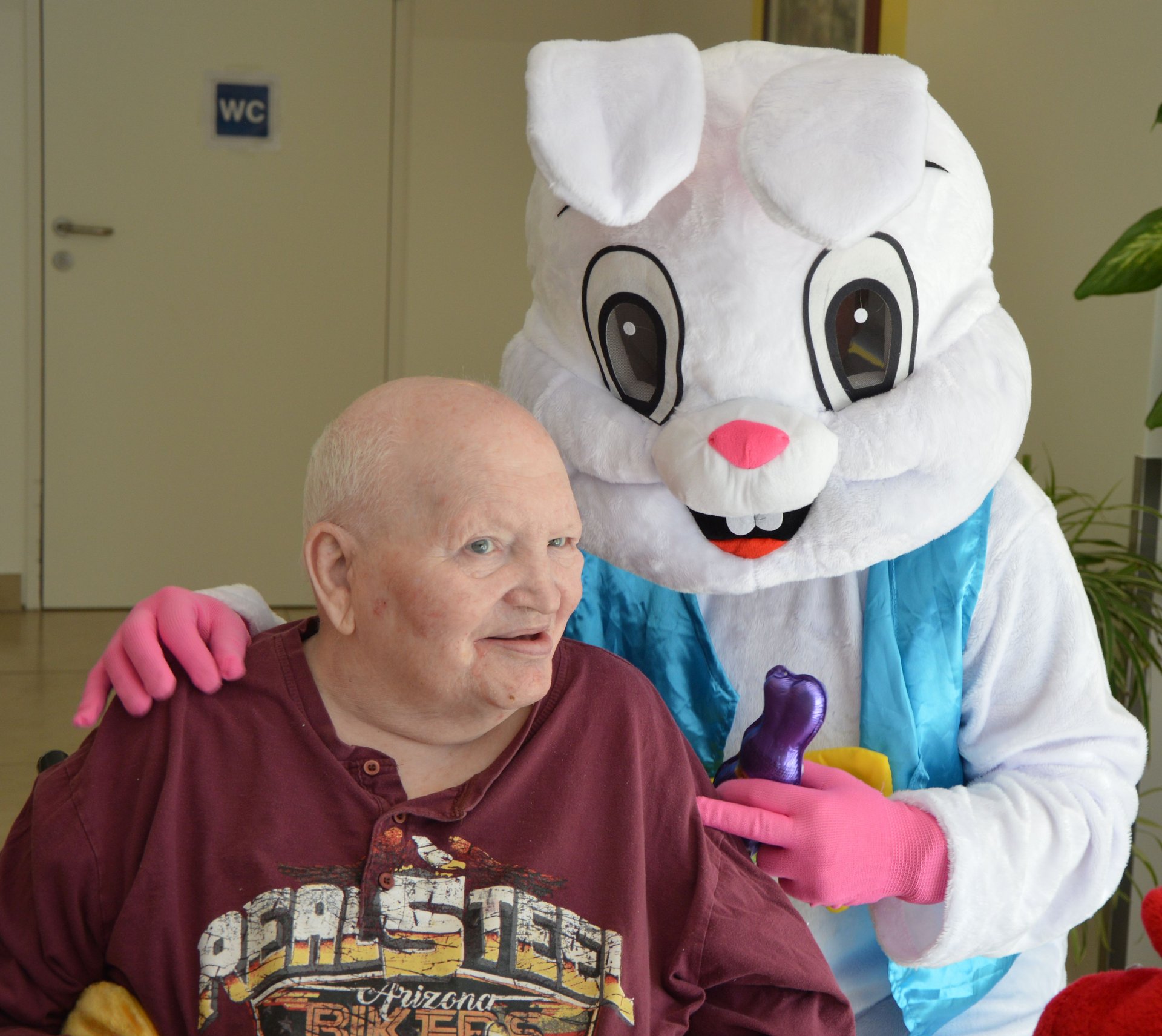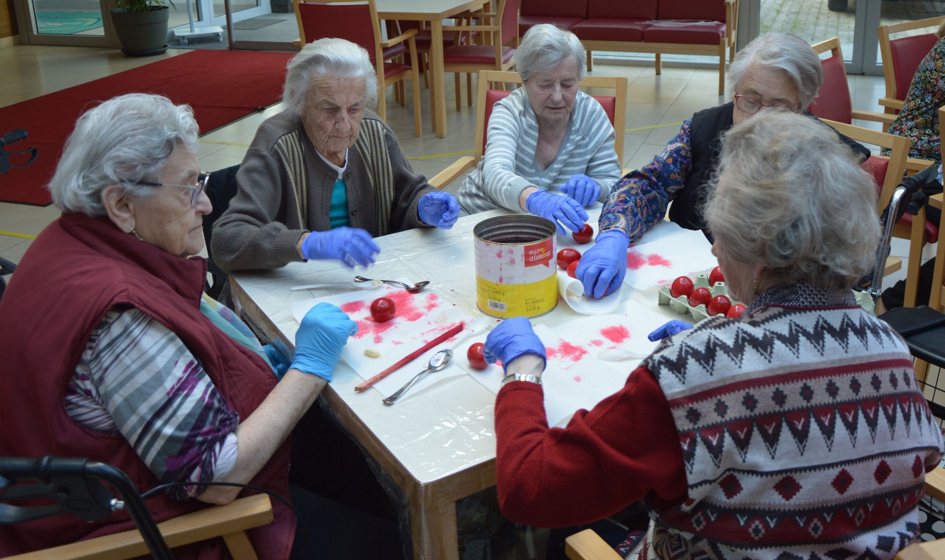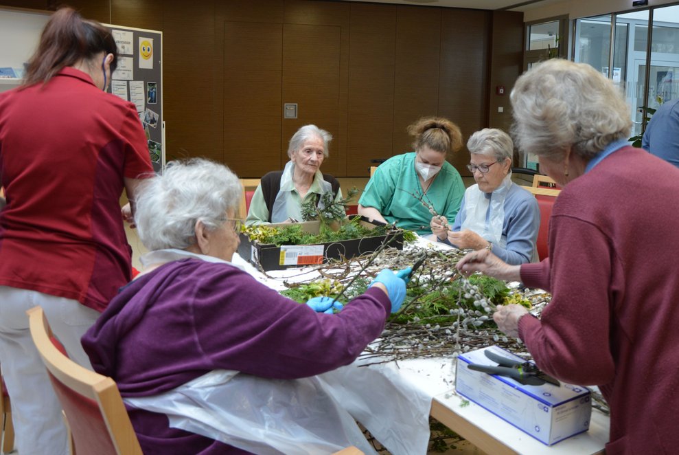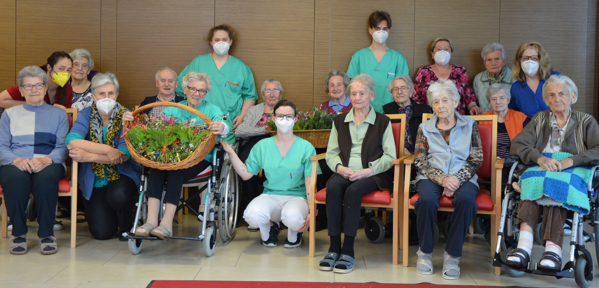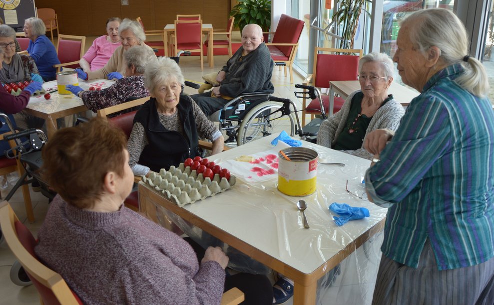 Bewohner und Bewohnerinnen waren mit Begeisterung bei den verschiedenen Osteraktivitäten dabei, zB. Palmbesen binden, Ostergebäck backen, kleine süße Hasen waren zu Besuch, Ostereier färben und der Osterhase war zu Besuch.