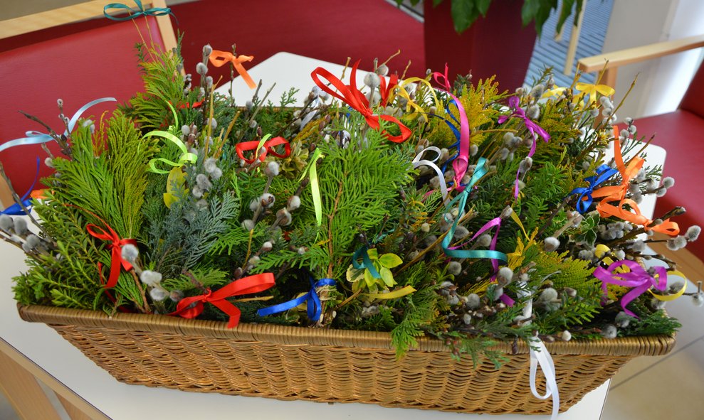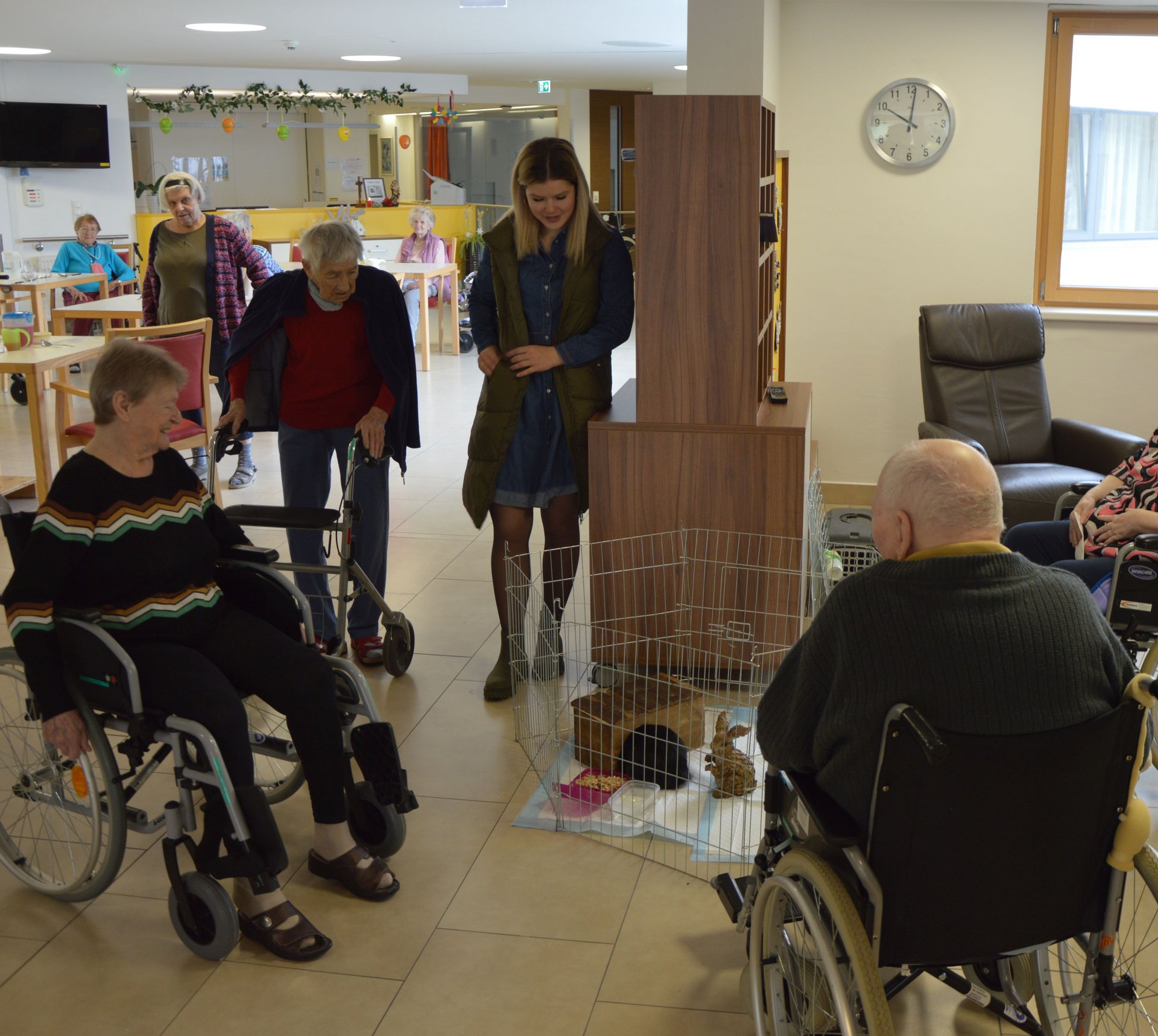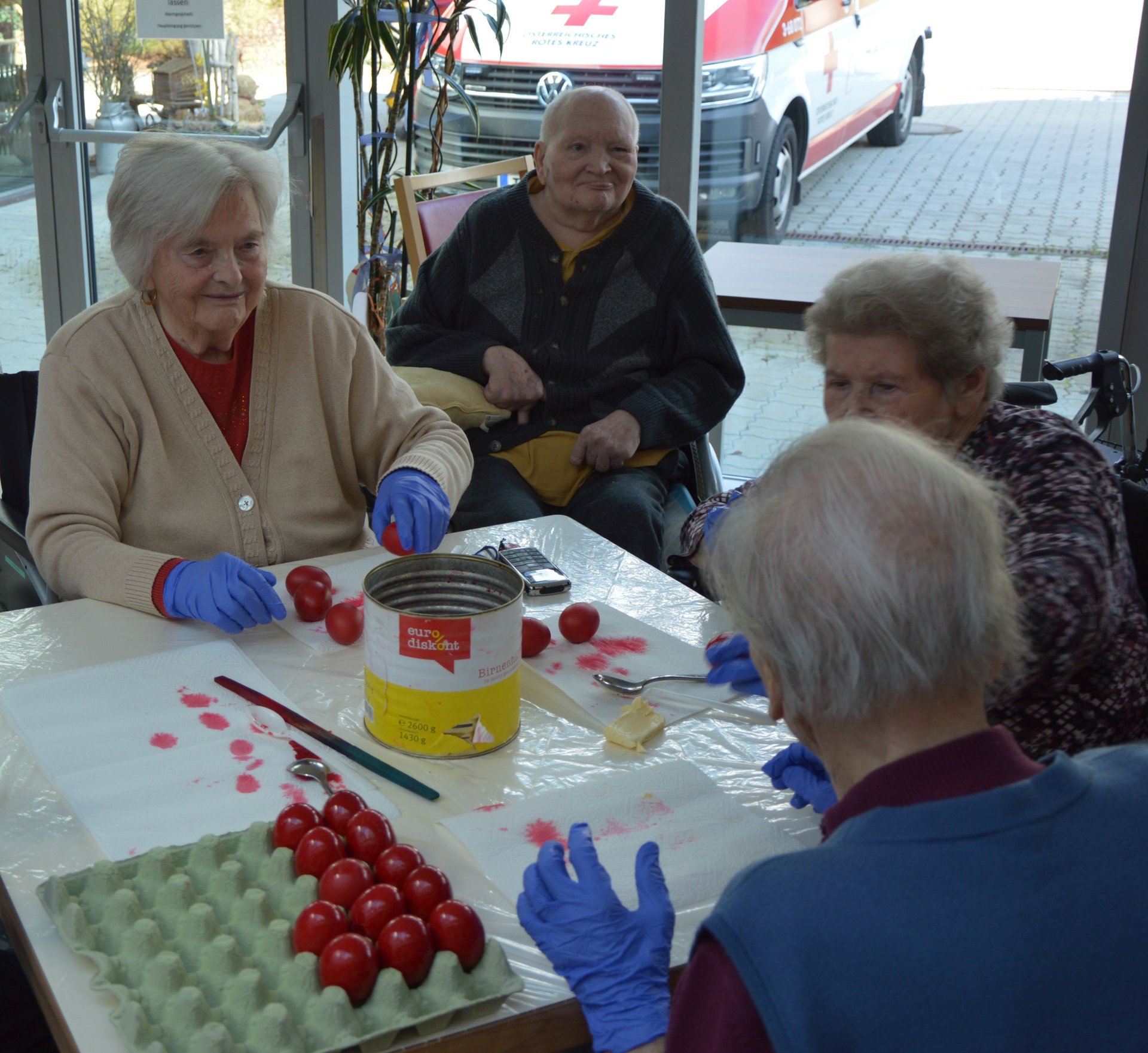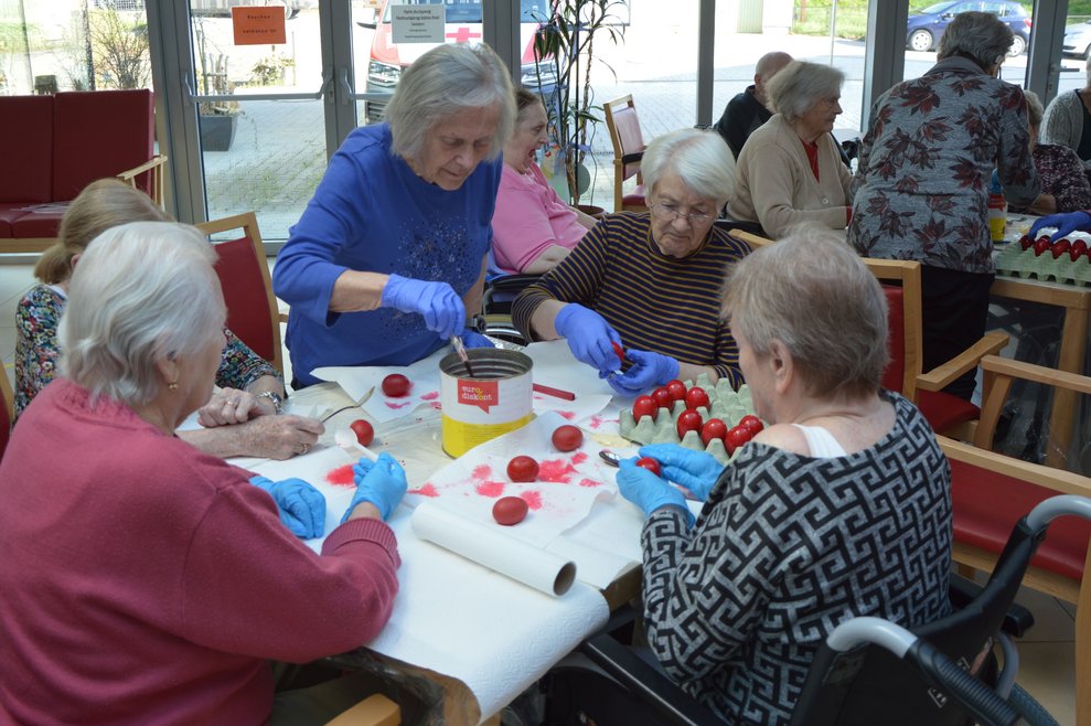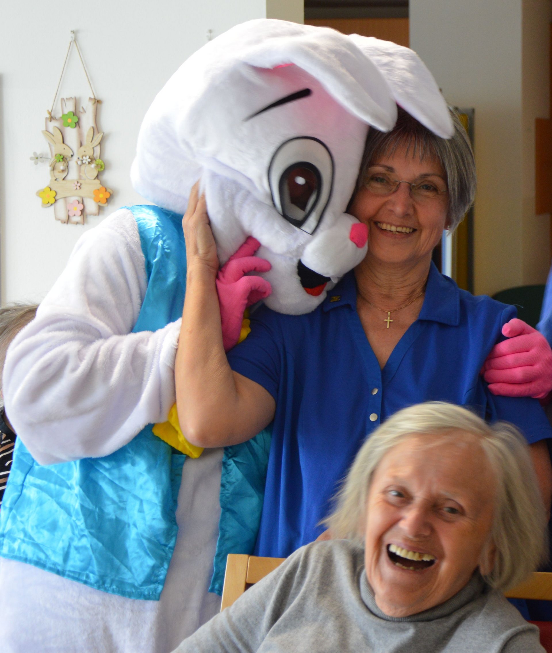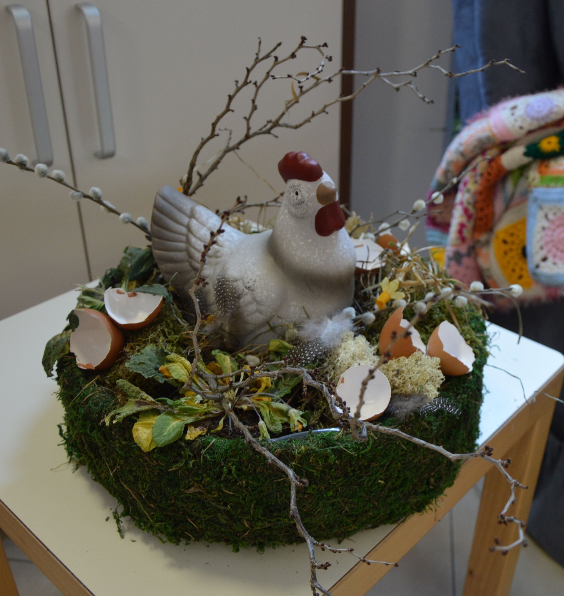 Bewohner und Bewohnerinnen waren mit Begeisterung bei den verschiedenen Osteraktivitäten dabei, zB. Palmbesen binden, Ostergebäck backen, kleine süße Hasen waren zu Besuch, Ostereier färben und der Osterhase war zu Besuch.